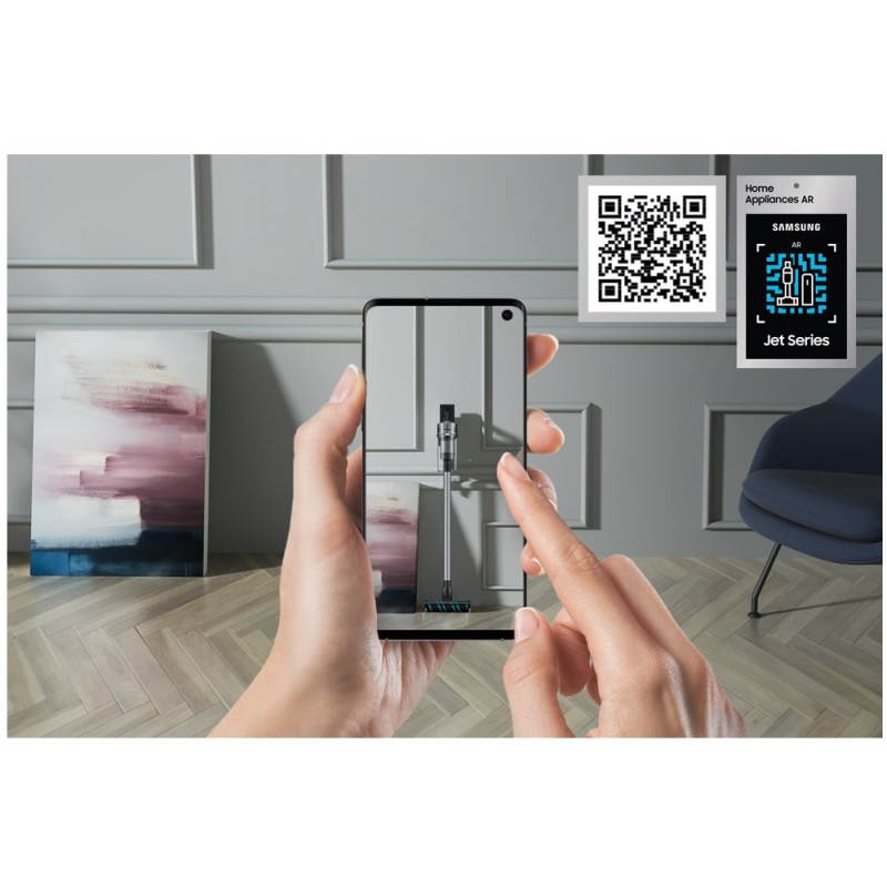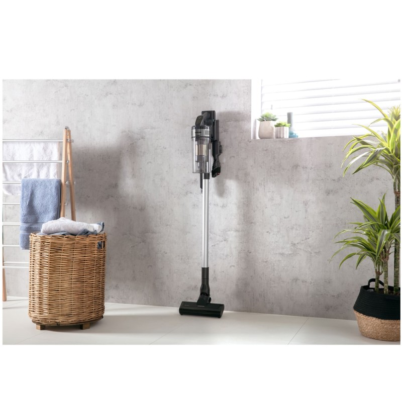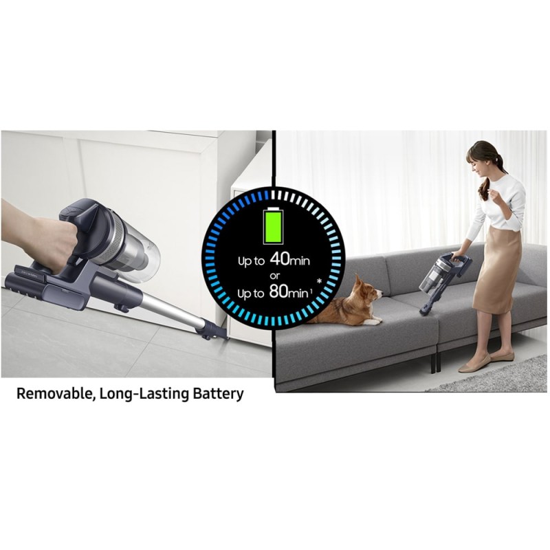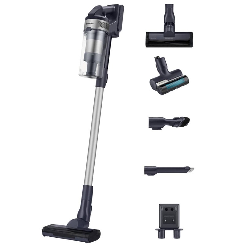 جارو شارژی سامسونگ VS15A6032R5 سبک‌ترین جارو شارژی کمپانی کره‌ای سامسونگ در سال 2021 است که به شما کنترل بیشتری روی تمیز کردن می‌دهد. باید گفت که طراحی سبک وزن این جاروشارژی کنترل حداکثر و آسان را هنگام استفاده از جارو شارژی در اطراف خانه شما را تضمین می‌کند. این محصول ممکن است در بازار با عنوان جارو شارژی سامسونگ VS6700 یا Jet 60 نیز معرفی شود که البته مدل کامل و دقیق محصول فوق نیست. در حال حاضر مونتاژ ویتنام این جارو شارژی ایستاده سامسونگ در بازار ما موجود می‌باشد. طراحی بی‌سیم جاروشارژی jet 60 سامسونگ این اطمینان را به شما می‌دهد که نیازی به نگرانی در مورد افتادن کابل برق نداشته باشید، در حالی که ساختار سبک وزن آن به شما امکان می‌دهد آن را بردارید و با کم‌ترین تلاش حمل کنید. در واقع این مدل جارو شارژی برای نظافت خانه، خودرو یا ماشین، و حتی موی حیوانات بسیار مناسب است و می‌تواند کارایی عالی را از خود به نمایش بگذارد. جارو شارژی Samsung Jet 60 برای نظافت کارگاهی طراحی نشده است. عملکرد رضایت بخشی را روی سطوح صاف مانند کف بتنی یا میز کار ارائه می‌دهد و روی فرش‌های کم پرز عملکرد خوبی دارد، اما برای جارو کشیدن زباله‌های معمولی کارگاه مانند براده‌های چوبی یا فلزی مناسب نیست. همچنین قادر به مقابله با نشت مایعات نمی‌باشد. جارو شارژی ایستاده SAMSUNG VS15A6032R5 به موتور قدرتمند Digital Inverter مجهز است و با وجود کوچک بودن، قدرت مکش بسیار خوبی ارائه می‌دهد. حداکثر قدرت این موتور 150 وات می‌باشد و سطح نویز ایجاد شده از این دستگاه در هنگام استفاده 86 دسی‌بل است.