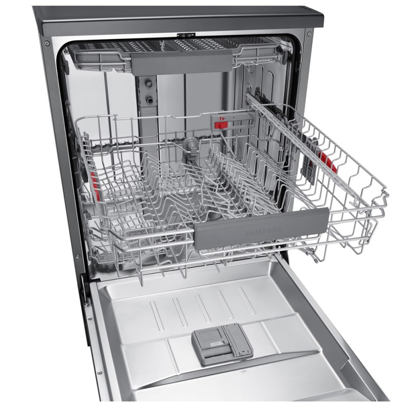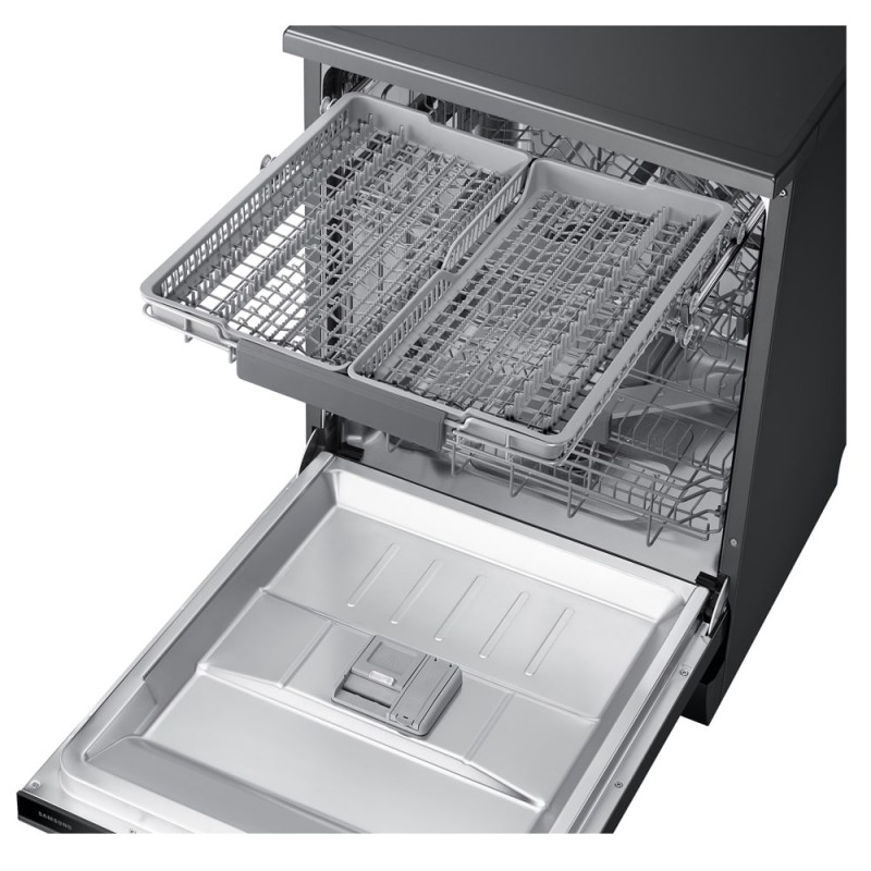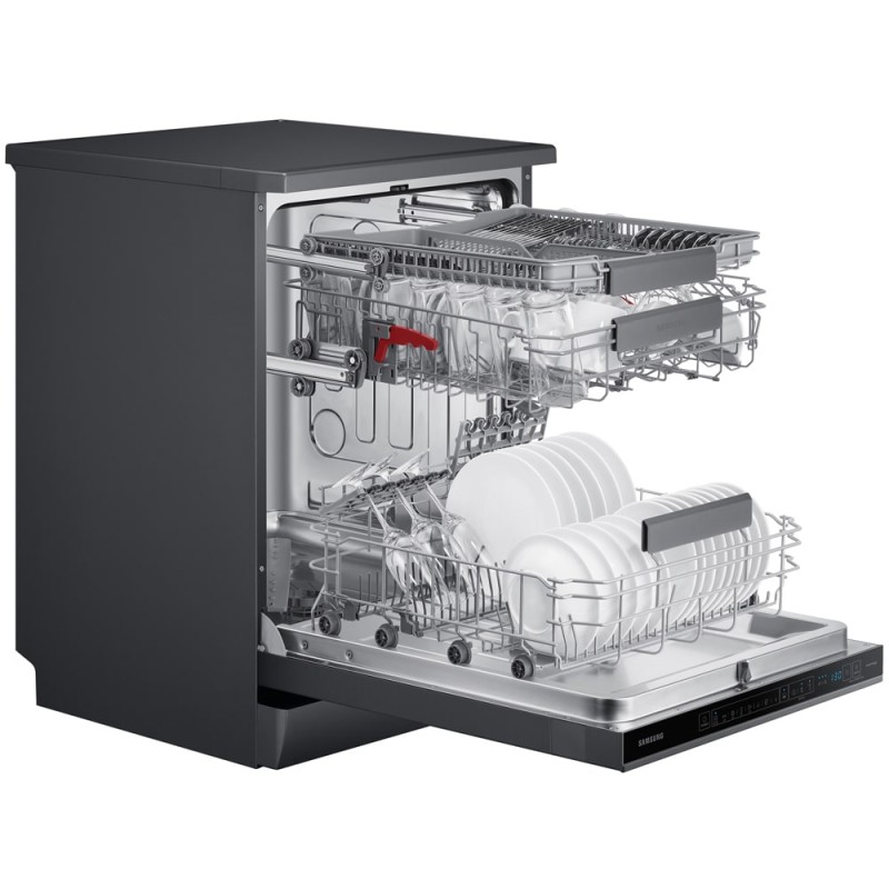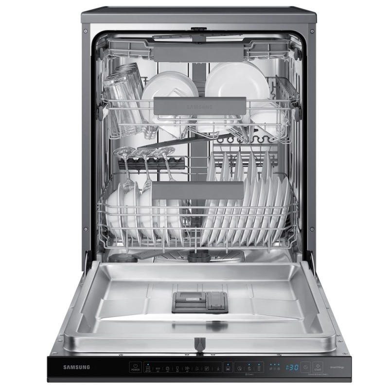 ماشین ظرفشویی Samsung DW60A8050FG جزو ظرفشوییهای 3 طبقه موجود در بازار میباشد یعنی اینکه دارای 3 سبد است که به شما این امکان را میدهند بتوانید که هر نوع ظرفی با هر شکل و اندازهای را به راحتی در آن قرار دهید و با محدودیتی مواجه نشوید. بالاترین طبقه در این محصول جهت شستشوی قاشق و چنگال قرار داده شده است که این امکان را به شما میدهد بدون ایجاد به هم ریختگی و شلوغی، آنها را به صورت جداگانه بشویید و کاملا تمیز در اختیار داشته باشید. این طبقه همچنین قابلیت انعطافپذیری دارد و میتوانید آن را خم کرده و راحتتر ظروف خود را در آن قرار دهید. طبقه میانی این محصول برای قرار دادن ظروف کوچک و متوسط مانند کاسه و پیش دستی طراحی شده است. شاخکهای کوچکی نیز در این طبقه تعبیه شدهاند که میتوانید ظروف خود را بینآن ها قرار دهید و همچنین از پایههای نگهدارنده لیوانهای پایهدار برای جلوگیری از شکستن و یا لب پر شدن آنها استفاده کنید. طبقه پایینی این محصول نیز مختص ظروف بزرگتر مانند ماهیتابه و سینی طراحی شده تا بتوانید آنها را نیز به راحتی بشویید. ضمن اینکه این ماشین ظرفشویی دارای یک پنل لمسی مخفی میباشد که در بالای دستگیره درب قرار گرفته است. از طریق این منو میتوانید برنامه شستشو مورد نظر را انتخاب کنید و یا در مورد زمان باقی مانده و درجه حرارت آب و غیره اطلاعات بدست آورید.