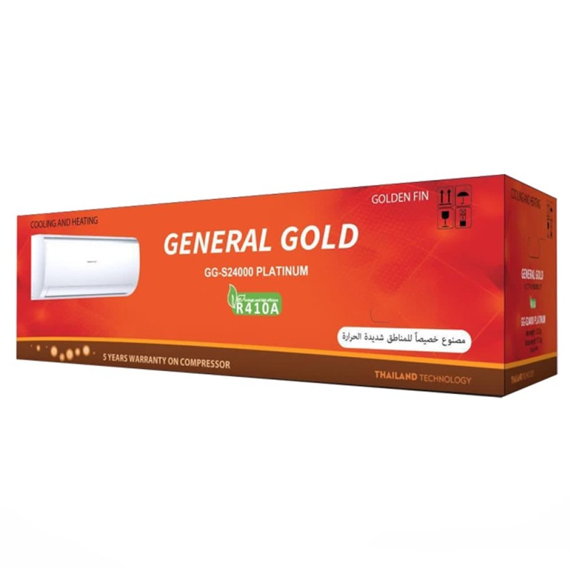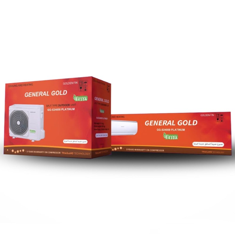 جنرال گلد نیز همانند بسیاری از تولید کنندگان کولرهای گازی این محصول را به دو بخش یونیت خارجی و یونیت داخلی تقسیم کرده است. بخش خارجی این کولر گازی مربوط به کمپرسور و یا همان موتور و بخش داخلی آن هم مربوط به پنل دستگاه می باشد. مدل در نظر گرفته شده برای هر دو بخش این دستگاه GG-MS24000 PLATINUM می باشد. همان طور که گفتیم ظرفیت این مدل برابر با 24 هزار بی تی یو (BTU) است که در واقع این ظرفیت برابر با 2 تن (Ton) است و در کل می توان گفت که این سیستم تهویه ی مطبوع دیواری می تواند محیطی خنک و یا گرم را برای شما فراهم کند.
